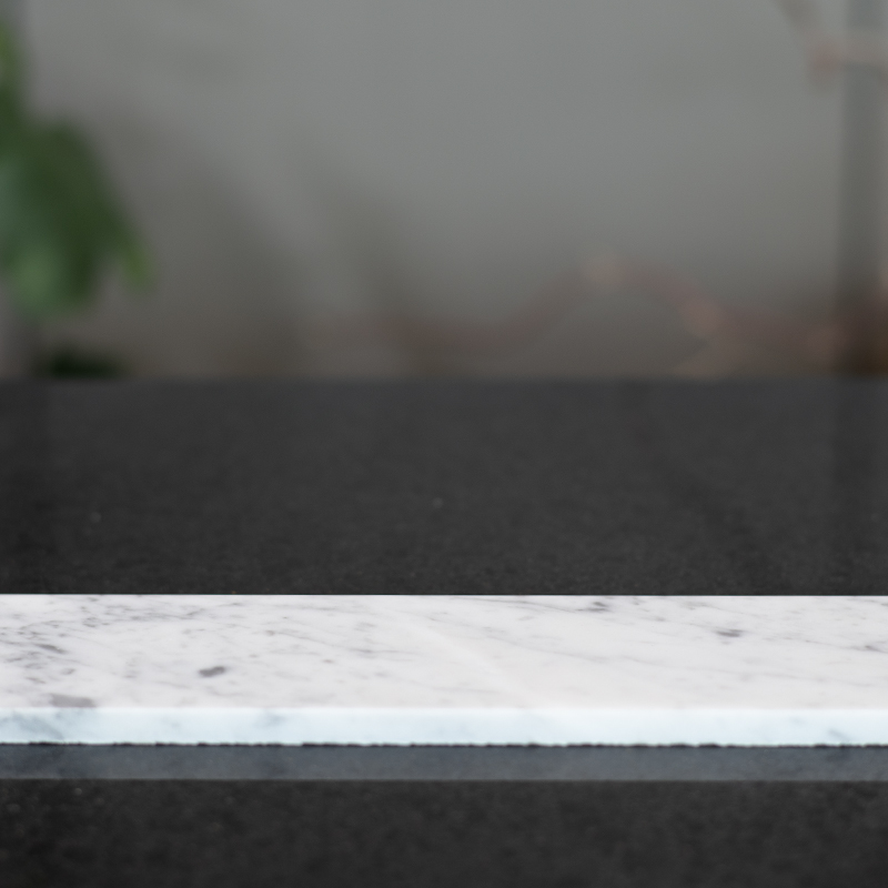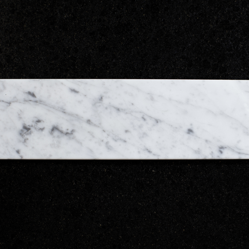 Bianco Carrara sockel 8 cm hög, med slipad fasad kant. 10mm tjocklek. Fallande längder.